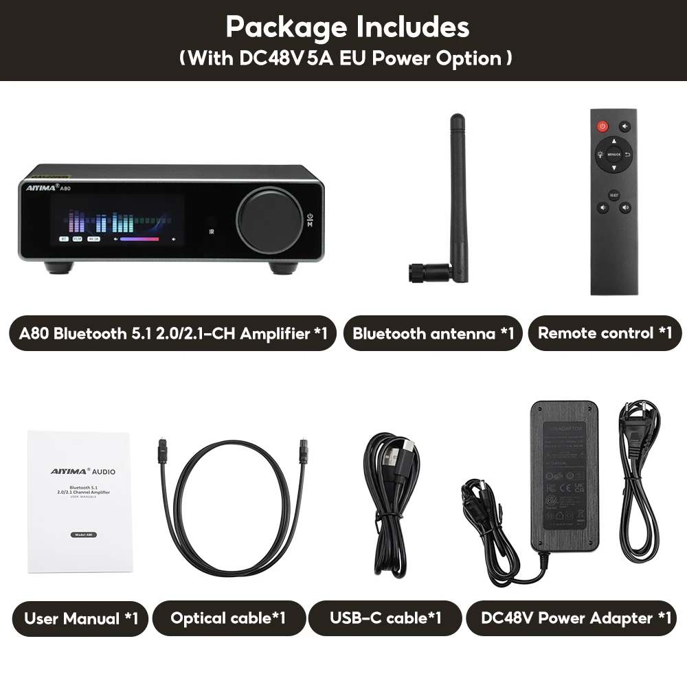 The Aiyima A80 is an all-in-one DAC amplifier designed to deliver high-fidelity audio. It combines a high-performance ES9038Q2M decoder chip with a powerful TPA3255 Class D amplifier chipset to provide rich, detailed sound with support for DSD512 and PCM ultra-high-resolution audio.